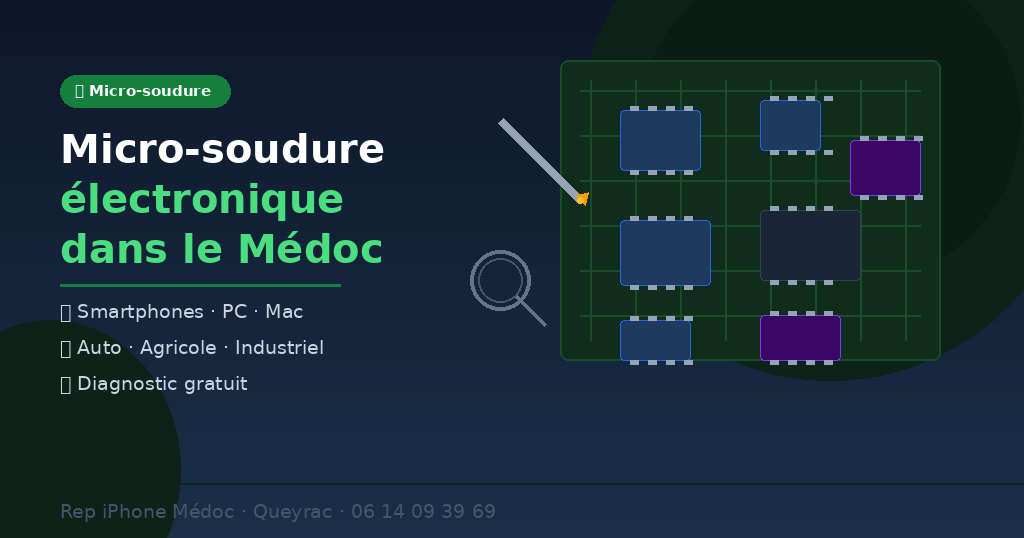 Carte mère HS, composant arraché, court-circuit, puce défaillante — la micro-soudure permet de réparer ce que la plupart des ateliers refusent de toucher. Rep iPhone Médoc à Queyrac intervient sur tout type d’électronique : smartphones, ordinateurs, mais aussi équipements automobiles, agricoles et industriels.